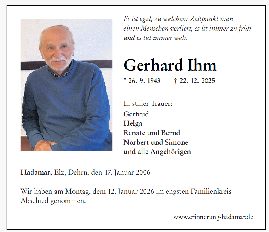 Liebe Geschwister Ihm, zu dem überaus schmerzlichen Verlust eures lieben Bruders Gerhard mein tiefst empfundenes Mitgefühl. Christa Ludwig. Ruhe in Frieden, lieber Gerhard.c