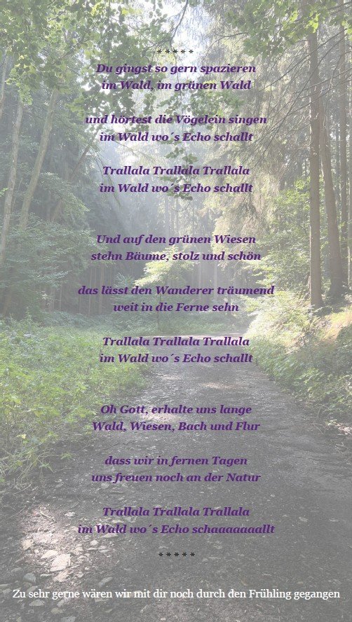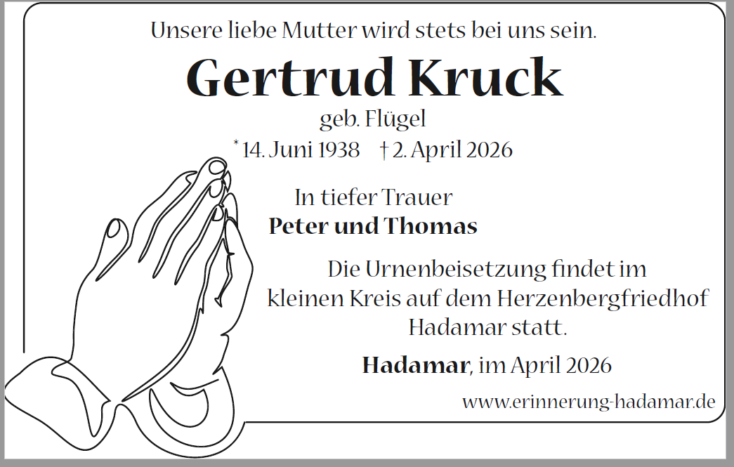 Von allen Seiten umgibst Du michund hältst Deine Hand über mir.Psalm 139,5Mein aufrichtiges Beileid zum Tode Eurer Mama. Ich werde ihr singen und jodeln nicht vergessen, ebenso ihr Lächeln. Ich werde Frau Kruck vermissen