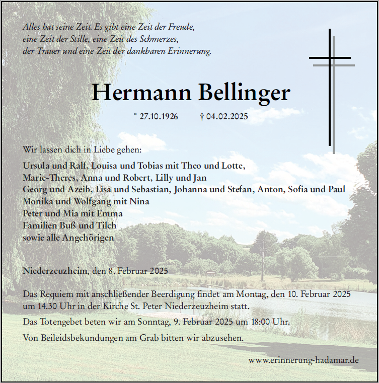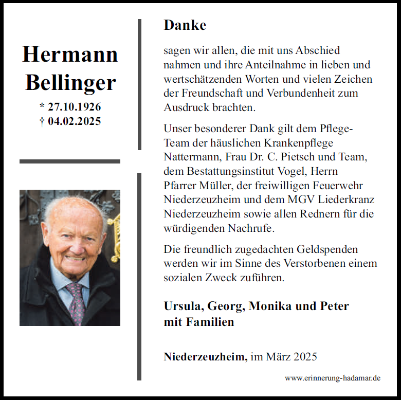 Liebe Familie Bellinger Ich habe mit Ihren Eltern und meinen, Karl und Käthe Herz, schöne Zeiten besonders im Rahmen der Verschwisterung Hadamar -Bellerive erleben dürfen. Ich bin traurig, dass jetzt auch dieser Wegefaehrte meiner Eltern sich auf seinen letzten Weg gemacht hat. Aber froh diesen herzlichen und aufrechten Menschen gekannt haben zu dürfen! Ihnen allen meine herzlichsten Beileidswünsche Elisabeth Lamp, Trier
