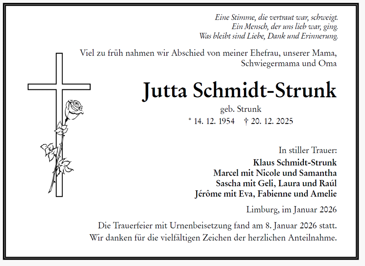 Lieber Klaus, Marcel, Sascha und Jeronimo mit euren Familien Die schlimme Nachricht, dass Jutta so früh gehen musste bedrückt uns immer noch. Wir denken an euch und wünschen euch Trost und Kraft in dieser schweren Zeit Josef und Kinder
