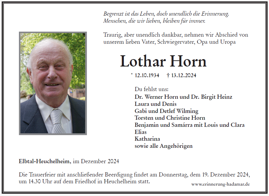Wenn wir Lothar und Irmgard besuchten, wurden wir stets sehr freundlich empfangen und großzügig mit Kaffee und Kuchen verwöhnt. Für mich war es immer wie eine Heimkehr in meine zweite Heimat. Die erste war Königsberg gewesen. Als meine Familie 1944 in den Westerwald geflüchtet war, wurden wir nach kurzem Aufenthalt in der Elbmühle bei Familie Reichwein einquartiert. So begann eine jahrelange Freundschaft mit Irmgard und später mit Lothar, die viele schöne Erinnerungen hinterließ. Meine Kinder fanden es sensationell, wenn Lothar seine Musikinstrumente vorführte und Harry das Schlagzeug ausprobieren durfte. Es waren unvergeßliche Stunden für uns. Wie Lothar bei aller schweren Arbeit so fröhlich, humorvoll und musikalisch aktiv sein konnte, war bewundernswert. Seine Klarsicht, insbesondere auch betreffs der politischen und gesellschaftlichen Lage in unserem Land war bis zuletzt erstaunlich. Wir trauern nach seinem Heimgang um einen wertvollen, klugen und außergewöhnlichen Menschen. Meine Familie spricht allen Angehörigen und Freunden unser herzliches Beileid aus.