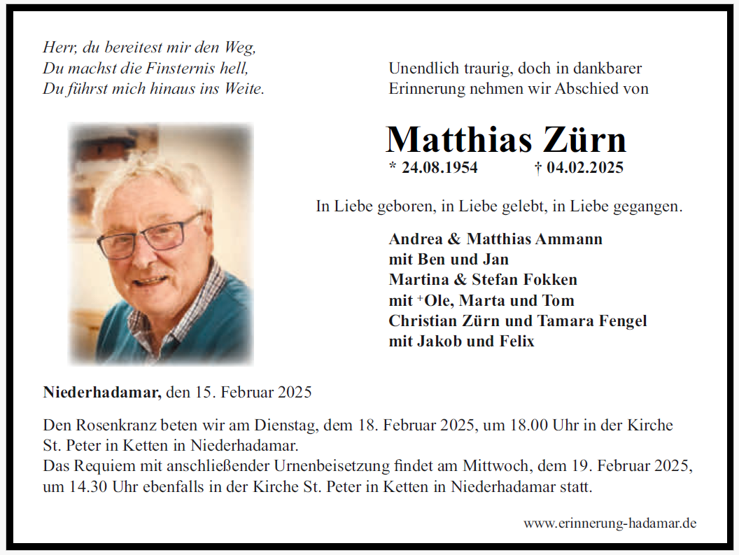 Sehr geehrte Frau Zürn, ich habe erfahren müssen, daß ihr Mann für immer von uns gegangen ist. Wenn wir uns auch nur durch meine Dienstzeit, ich als einfacher Panzerschütze in Ausbildung von 1984/88 im 4 PzBtl 284 gekannt haben, darf ich Frau Zürn Ihnen versichern, daß ich Ihren Mann Hauptmann Zürn als sehr angenehmen, fairen und bemerkenswerten Menschen kennengelernt zu haben, dem ich einiges zu verdanken gehabt habe. Bitte erlauben Sie mir, Ihnen und Ihrer Familie mein aufrichtige Anteilnahme zu übermitteln. Altenstadt 10.02.2025 Mit stillen Grüßen Wasylein Davis