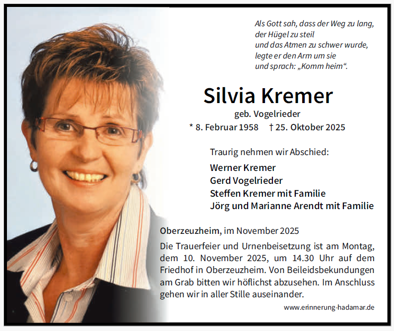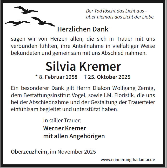 Ich bin sehr betroffen und habe erst heute von dem Heimgang von Silvia erfahren. Ich habe sie beim Sport (Tussis Langendernbach) vor vielen Jahren kennen gelernt. Sie war so eine freundliche und fröhliche Persönlichkeit. Und nun viel zu früh von dieser Welt geschieden.