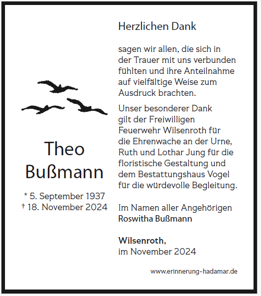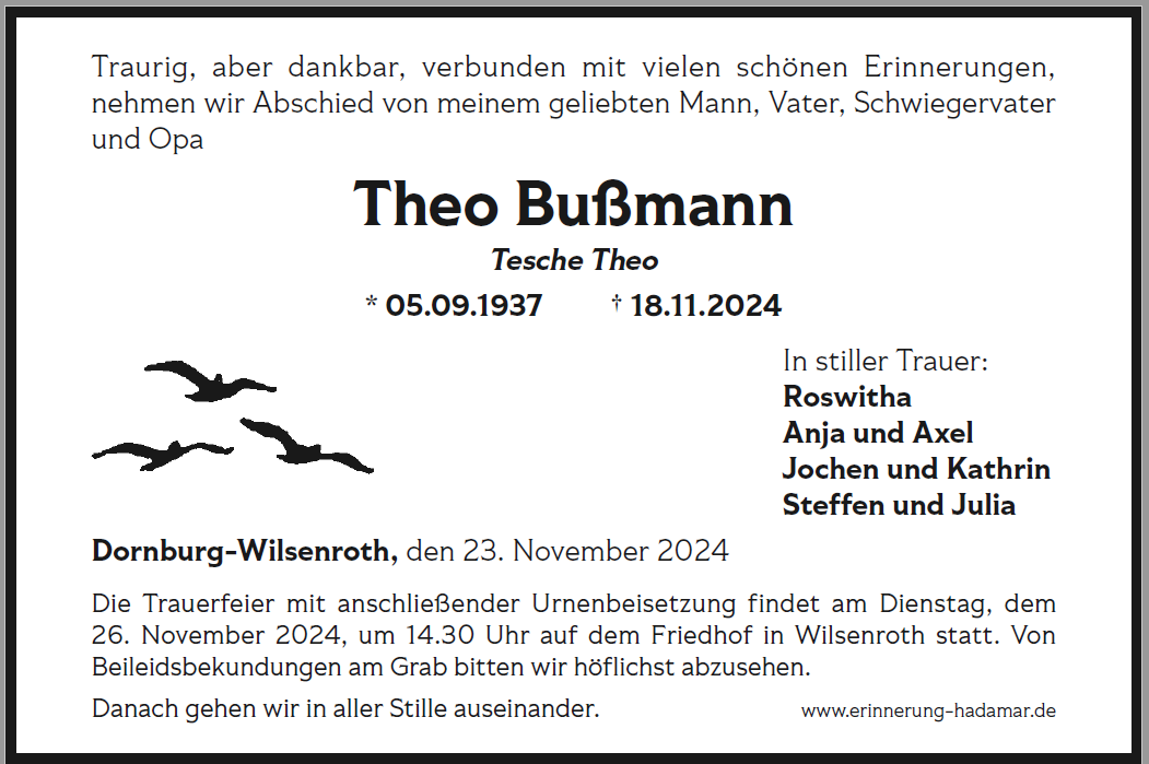 Lieber Theo. Mit Dir hat uns ein weiteres Original verlassen. Deine humorvolle, aber immer auch kritische Sicht auf die Welt, Deine Liebe zu Tieren und das ein oder andere Ständchen aber bleiben unvergessen... unser herzlichstes Beileid gilt allen Angehörigen! Bernd und Silke