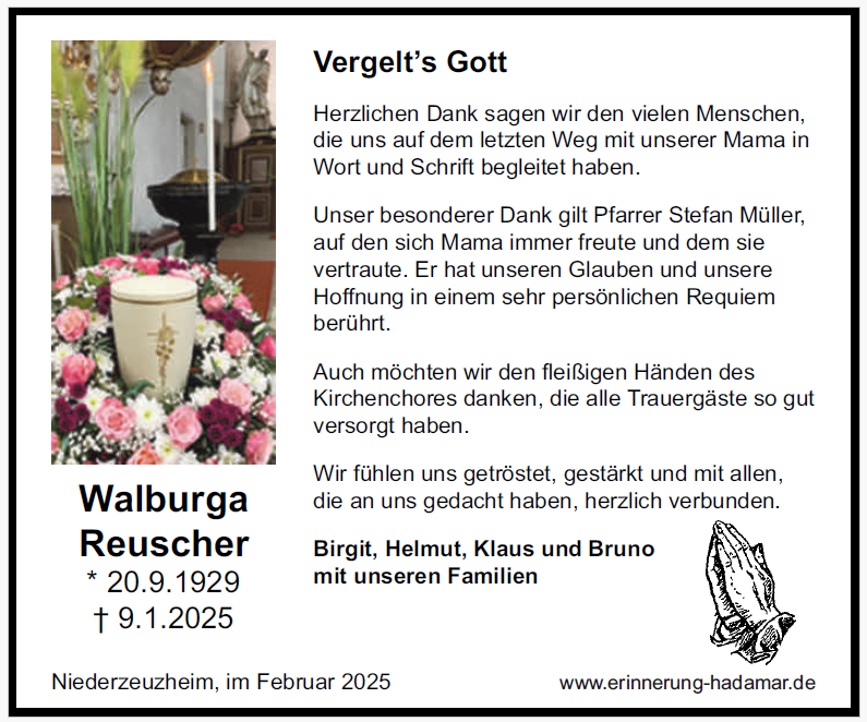 Du hast mich als Neubürgerin in Niederzeuzheim ganz liebevoll 2002 überredet den örtlichen Kirchenchor beizutreten! Habe dann dort mit dir gemeinsam als eine der älteren Sängerinnen noch 11 Jahre zusammen verbringen können!