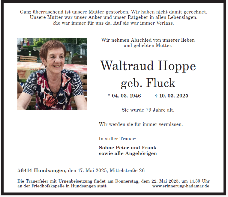 Unsere Mutter war immer für uns da und hat immer alles gegeben, damit wir ein schönes Leben haben. Sie war ein guter Mensch. Wir vermissen sie sehr. Wir, das sind Peter und Frank!